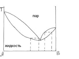 Первый закон Вревского показывает, как влияет изменение температуры на состав одной из фаз при заданной составе другой фазы: при повышении температуры раствора заданного состава его пар обогащается тем компонентом, парциальная молярная теплота испарения которого больше. Этот закон справедлив как для растворов с азеотропом, так и без него. Азеотропным называется раствор, у которого состав пара совпадает с составом жидкости. На рис. 15 показано влияние температуры на состав пара при заданном составе жидкости (без азеотропа). Теплота испарения труднолетучего вещества больше теплоты испарения легколетучего, поэтому равновесный с жидкостью пар с повышением температуры будет обогащаться компонентом А, например, от его мольной доли