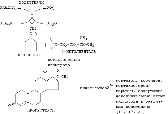 - образование дополнительных боковых радикалов в результате реакции гидроксилирования с помощью специальных ферментов монооксигеназ (гидроксилаз) - чаще всего в 11-м, 17-м, и 21-м положениях (иногда в 18-м). На первом этапе синтеза стероидных гормонов сначала образуются предшественники (прегненолон и прогестерон), а затем другие гормоны (кортизол, альдостерон, половые гормоны). Из кортикостероидов могут образоваться альдостерон, минералокортикоиды.