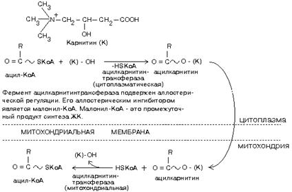Ацил-КоА не может проходить через мембрану митохондрий. Поэтому имеется специальный механизм транспорта ЖК из цитоплазмы в митохондрию при участии вещества "КАРНИТИН". Во внутренней мембране митохондрий есть специальный транспортный белок, обеспечивающий перенос. Благодаря этому ацилкарнитин легко проникает через мембрану митохондрий.