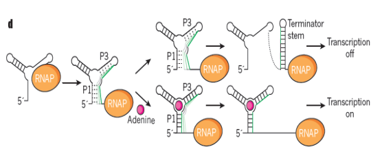 Рибопереключатели: трансрикпция с помощью РНК-полимеразы, далее образуется транскрипт, который потом кодирует белок-насос, откачивающий избыток аденина у бактерий. Образуется шпилька, если нет аденина, – сигнал терминации – нет трансрикпции, белок-насос не образуется. Аденин меняет конформацию участка и шпилька образоваться не может. Транскрипция идет, насос образуется.