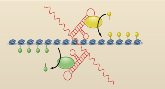 На картинке – нкРНК с двумя доменами и она привлекает своими специфическими последовательностями (один домен) белок-писатель (негативная метка). А другой домен этой нкРНК привлекает белок, который стирает позитивную метку. То есть они работают согласованно.