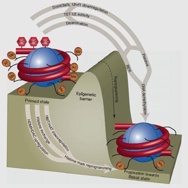 Есть эпигенетический барьер. Есть нуклеосомная структура. Хвосты гистонов могут быть ацетилированы и метилированы. И чтобы из метилированного состояния перейти в деметилированное и всякое подобное – нужна активация/инактивация соответствующих ферментов. Это перескок из одной долины в другую долину.