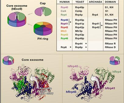 Экзосома - контроль потока генетической информации, конкуренция с машиной процессинга (в каком то плане да, конкуренция, ведь если процессинг неверный, то экзосома ест транскрипт, или если не нужен процессинг, тоже ест). Экзосома осуществляет proof-reading транскриптов в клетках дикого типа (это для РНК-полимеразы, ведь она тоже ошибается). Экзосома разрушает СUT (сryptic untranslated transcripts) транскрипты (для чего они нужны неясно). Она обладает 3`- экзонуклеазной и эндонуклеазной активностями.