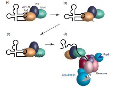 Есть некий комплекс, в который входит РНК-хеликаза, еще фиолетовая субъединица – полиА-полимеразная активность, еще другие белки. Этот комплекс узнает новообразованный транскрипт, осуществляет его полиаденилирование (но необычное, очень коротенькое полиА). А потом, когда этот комплекс соединился мишенью, то привлекается экзосома и начинается затягивание в нее конца РНК. Этот комплекс как раз и узнает неправильные конформации РНК. Чтобы экзосома функционировала, ей нужен однонитевой участок, который делает РНК-хеликаза.