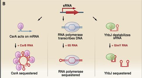 Левая стрелка - есть некий белок CsrA, который связывается с простенькой структурой: стволик+петля, которая на молекуле мРНК. Этот белок может осуществлять регуляцию трансляции соответствующей мРНК, укрепляя такие структуры. Дальше оказывается, что есть другая РНК (CsrB), которая имеет такую структуру, что каждый элемент этой структуры имитирует структуру мРНК, узнаваемую этим белком (стволик+петля). Эти белки переманиваются CsrB (РНК) и осуществляется регуляция трансляции.