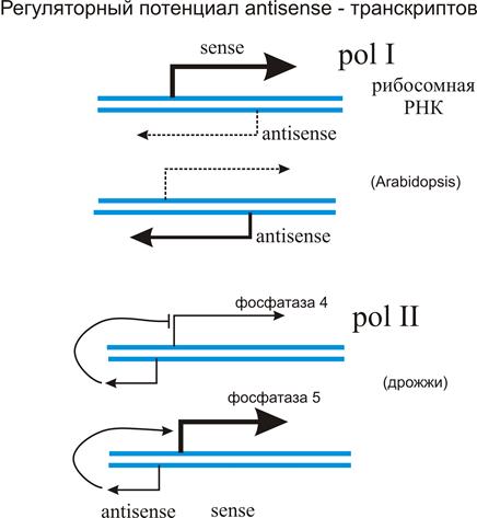 Интересный случай – естественные антисмысловые транскрипты. И для полимеразы 2 и для полимеразы 1 (интез рРНК). Синтез рРНК – регуляция транскрипции с участием нкРНК. У арабидопсиса – для синтеза рРНК существует нормальный транскрипт. определяющий структуру рРНК и существует антисмысловой транскрипит. И чтобы заставить замолчать какую-то структуру ядрышка индуцируется синтез антисмыслового транскрипта, который приводит к понижению интенсивности смыслового транскрипта Или у дрожжей – тоже транскрипты в двух направлениях. И если антисмысловой транскрипт достаточно сильно производится, то это приводит в подавлению экспресии (в частности, фосфатазы 4). А другая фосфатаза – наоборот антисмысловой транскрипт привлекает что-то такое, что активирует транскрипцию этой самой фосфатазы.