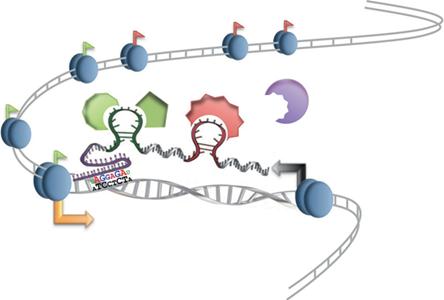 Сегодня нам покажут две вещи: 1) регуляторные нкРНК могут взаимодействовать с белками и другими РНК и вызывать их конформационные изменения, 2) и еще, что сам акт транскрипции меняет нуклеосомную структуру, и тем самым осуществляется динамика структуры хроматина (за счет транскрипции). Еще когда осуществляется транскрипция, новооброзованный транскрипт (еще висит на ДНК) – его узнают белки, модифицирующие белки хроматина и ДНК, и привлекаются к тому месту, где осуществляется транскрицпия (то есть не только определенные белки узнают определенные домены, но и просто транскрипты могут привлекать). Есть РНК со смешанными функциями: она может быть некодирующей, а в определенном случае может участвовать в кодировании белка.