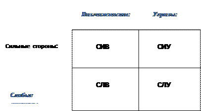 Матрица SWOT (от англ. слов: сила, слабость, возможности, угрозы) имеет следующую структуру: