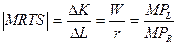 Еcли количество капитала растет на 1 ед., а все остальные параметры фиксированы, то предельный продукт капитала будет добавлением к общему продукту, или дополнительным увеличением его. Абсолютное значение MRTS сокращается при движении по кривой слева направо.