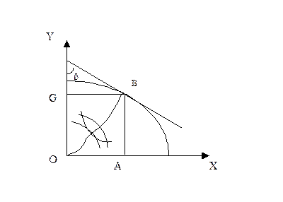 OGBA - ящик Эжуорта: 2 потребителя (О и В), два товара (X и Y), ОB - линия контрактов. Предельная норма замещения должна быть равна предельной норме трансформации.