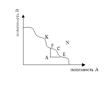 Вдоль кривой потребительских возможностей невозможно улучшить положение одного человека без ухудшения положения другого. Она имеет отрицательный наклон, т.к. на кривой увеличение полезности одного может произойти за счет уменьшения полезности другого. Точки ниже кривой неэффективны, точка N недостижима.