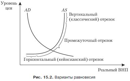 Различные подходы двух экономических школ видны на кривой совокупного предложения (AS). Классической точке зрения, согласно которой экономика посредством саморегулирования приходит к тому объему производства, при котором достигается полная занятость, соответствует вертикальный отрезок кривой предложения.