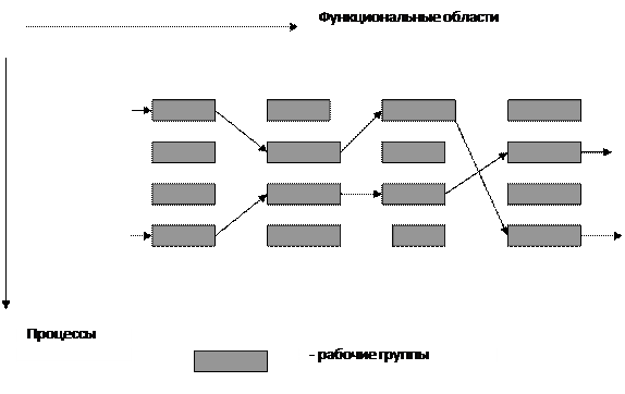 Концепция группировки работ вокруг продукта и результата (как в традиционных матричных организациях) заменяется на новую концепцию группировки работ вокруг функциональных областей и бизнес-процессов (см. рисунок).
