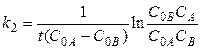 В случае, когда для реакции второго порядка А + В ® D начальные концентрации реагирующих веществ не равны (С 0А ¹ С 0В), уравнение для константы скорости принимает следующий вид: