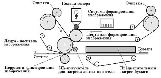 На рис. 13.3 представлена схема печатной секции ИГ на вращающейся ленте с диэлектрическим покрытием. Для увеличения долговечности дорогостоящего носителя изображение передается на бумагу не прямо, а через промежуточный носитель опять же в виде ленты. Предусмотрен предварительный нагрев бумаги, как одна из стадий многоступенчатого процесса фиксирования (закрепления).