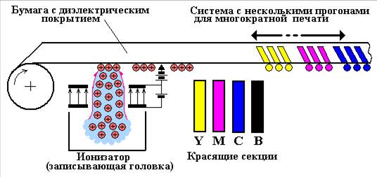 В указанном примере четырехкрасочная печать осуществляется таким образом, что однокрасочные изображения последовательно формируются одним ионным источником, а затем окрашиваются тонером. После первого прогона бумажного полотна производится его возврат и нанесение второго однокрасочного изображения, затем третьего и четвертого (система с несколькими прогонами Multipass). Для проводки полотна применяется система высокой точности. Установка D\P-1000, выполненная по данному принципу, была представлена в качестве пробопечатной системы в 1995 г. фирмой NTT-AT [6]. Существует также вариант секционного построения печатной установки (система с одним прогоном), в котором перед каждой секцией установлен отдельный ионный источник.