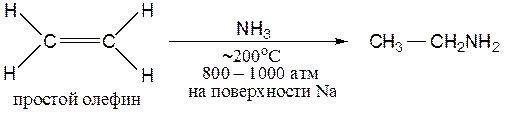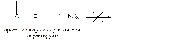 Поскольку а) аммиак и амины являются значительно более слабыми кислотами, чем вода, спирты и тиолы, и поскольку б) кислоты не катализируют присоединение этих реагентов к двойным связям из-за образования аммониевых солей, присоединение аммиака и аминов к двойным связям не может идти по электрофильному механизму (мало кислоты – нет кислой среды из-за связывание кислоты аммиаком или амином, много кислоты – весь аммиак или амин превращается в аммониевый ион, и в реакционной массе нет свободного нуклеофила).