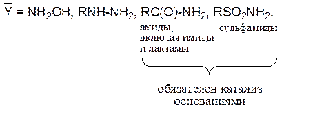 Реакция может катализироваться основаниями (в случае нуклеофилов выступают RNHy или R2Ny), причем в случае амидов катализ основаниями обязателен, поскольку они – очень слабые нуклеофилы:
