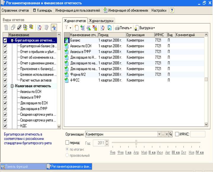 Форма «Регламентированная и финансовая отчетность» предназначена для работы с регламентированной отчетностью (бухгалтерской, налоговой, статистической и другой) и отчетностью по МСФО (Главное меню - <Отчеты> - <Регламентированные отчеты>).