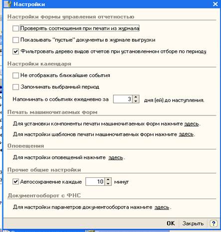 «Настройка» – вызывает диалог для управления свойствами формы «Регламентированная и финансовая отчетность» и общими свойствами регламентированных отчетов.