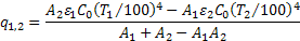Будемо рахувати, що степінь чорноти поверхонь не змінюється в діапазоні температур Т1 і Т2. Тлоді згідно закону Кірхгофа А1 = ε1 та А2 = ε2. Заміняємо А на ε та винісши ε1ε2С0 одержимо