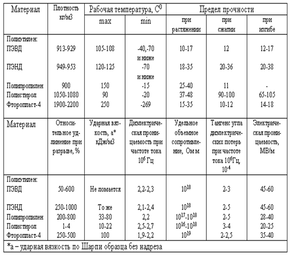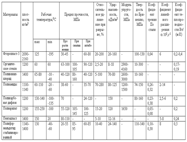 Особенностью пластмасс являются малая плотность (1-2 т/м3); низкая теплопроводность [0,1- 0,3 Вт/(м К)], значительное тепловое расширение, в 10 – 30 раз больше чем у стали; хорошие электроизоляционные свойства; высокая химическая стойкость, фрикционные и антифрикционные свойства. Прочность силовых пластиков сопоставима с прочностью стали и выше. Пластмассы имеют хорошие технологические свойства. Недостатками пластмасс является невысокая теплостойкость, низкий модуль упругости и ударная вязкость по сравнению с металлами и сплавами, а для некоторых пластмасс склонность к старению.