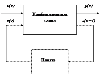 Кроме входных и выходных переменных, можно выделить некоторую совокупность промежуточных переменных, которые связаны с внутренней структурой автомата. В комбинационных схемах промежуточные переменные непосредственно не участвуют в соотношениях вход – выход. Напротив, выходные функции последовательностных схем в качестве своих аргументов, кроме входных переменных, обязательно содержат некоторую совокупность промежуточных переменных s1, s2,..., sk, характеризующих состояние схемы. Набор всех возможных состояний, которые присущи данной схеме, называется множеством состояний. Если S1, S2,..., Sk – конечные алфавиты переменных состояния s1, s2,..., sk, то множество S = S1