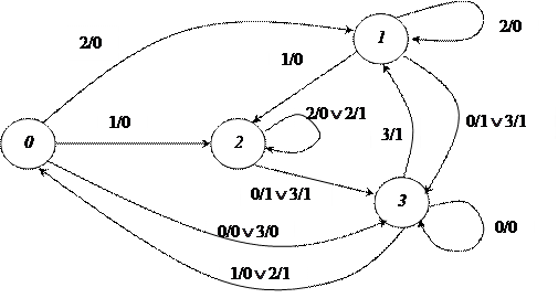 На рис. 2 показан граф, построенный в соответствии с приведенной общей таблицей переходов. Так как из состояния 0 автомат переходит в состояния 1, 2 и 3, то из вершины 0 графа исходят дуги в вершины 1, 2 и 3. При этом переход в состояние 1 совершается под воздействием 2 и ему соответствует выход 0, поэтому дуга из вершины 0 в 1 помечается как 2/0. Переход в состояние 2 совершается под воздействием 1 и ему соответствует выход 0, поэтому дуга из вершины 0 в 2 помечается как 1/0. Переходы в состояние 3 совершаются под воздействиями 0 и 3 и им обоим соответствует выход 0, поэтому дуга из вершины 0 в 3 помечается как дизъюнкция 0/0