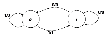 S2 = S, и все множества последующих состояний {1, 5}, {3, 5}, {4, 5} и {5} являются подмножествами S1 и S2, т.е. образуют наименьшую правильную группировку. Соответствующая минимальная форма показана на рис. 7, где состояния 0 и 1 соответствуют классам S1 и S2.