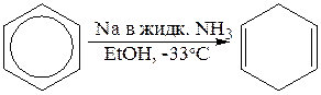 При восстановлении ароматических соединений натрием Na (калием K, литием Li) в жидком аммиаке, обычно в присутствии спирта (EtOH, i-PrOH, t-BuOH), идет 1,4-присоединение, и образуются несопряженные 1,4-циклогексадиены: