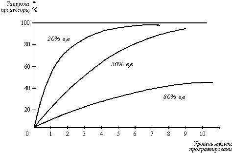 На рис. 7 показан график зависимости коэффициента загрузки процессора в зависимости от числа одновременно выполняемых процессов и доли времени, проводимого этими процессами в состоянии ожидания ввода-вывода.