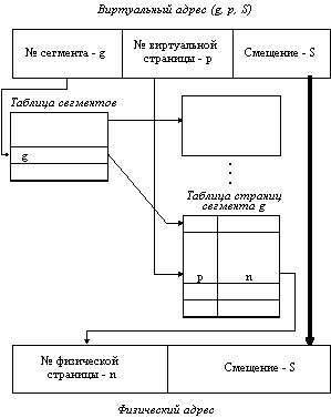 Как видно из названия, данный метод представляет собой комбинацию страничного и сегментного распределения памяти и, вследствие этого, сочетает в себе достоинства обоих подходов. Виртуальное пространство процесса делится на сегменты, а каждый сегмент в свою очередь делится на виртуальные страницы, которые нумеруются в пределах сегмента. Оперативная память делится на физические страницы. Загрузка процесса выполняется операционной системой постранично, при этом часть страниц размещается в оперативной памяти, а часть на диске. Для каждого сегмента создается своя таблица страниц, структура которой полностью совпадает со структурой таблицы страниц, используемой при страничном распределении. Для каждого процесса создается таблица сегментов, в которой указываются адреса таблиц страниц для всех сегментов данного процесса. Адрес таблицы сегментов загружается в специальный регистр процессора, когда активизируется соответствующий процесс. На рисунке 11 показана схема преобразования виртуального адреса в физический для данного метода.