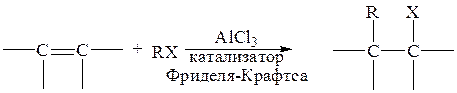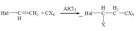 Полигалогеналканы этого типа присоединяются к галогеноолефинам в присутствии AlCl3 по электрофильному механизму – реакция Принса: