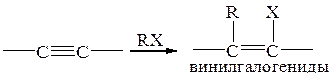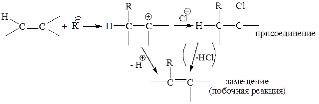 Механизм: атакующая частица – карбокатион, присоединение происходит по правилу Марковникова; побочно протекает замещение: