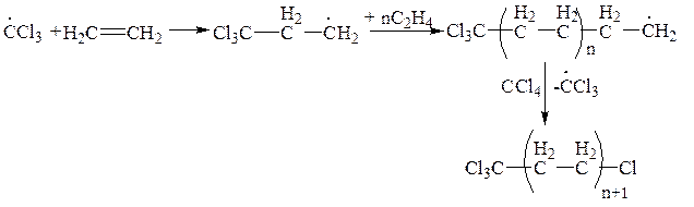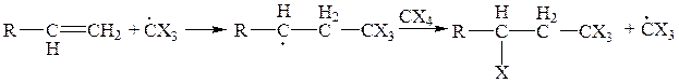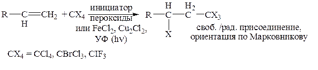 Присоединение простых полигалогеноалканов к двойной связи происходит с хорошими выходами целевых продуктов. Реакция представляет собой свободнорадикальное присоединение и идет в присутствии инициаторов. Первоначальная атака происходит по наиболее гидрогенизированному атому углерода, т. е. формально по Марковникову: