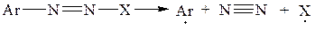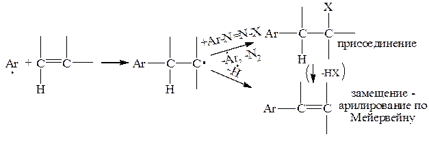Присоединение арилгалогенидов (ArX) можно осуществить по свободнорадикальному механизму при обработке олефинов солями диазония, хотя при этом конкурентно может идти арилирование по Мейервейну (замещение):