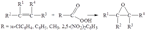 Наиболее часто используют м-хлорпербензойную кислоту. Электронодонорные заместители в олефине повышают скорость реакции. Процесс проводят в мягких условиях с высокими выходами. Используют также перуксусную, пербензойную кислоты. Наиболее реационноспособна 2,5-динитропербензойная кислота.