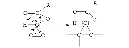 Доказательства механизма: 1) присоединение идет стереоспецифично (из транс-олефина образуется транс-эпоксид, из цис-олефина – цис-эпоксид); 2) реакция имеет 2-й порядок; 3) реакция легко проходит в неполярных растворителях, которые не способствуют гетеролитическому механизму (образованию ионов); 4) влияние заместителей в субстрате на скорость процесса показывает, что переходное состояние не носит карбокатионного характера.