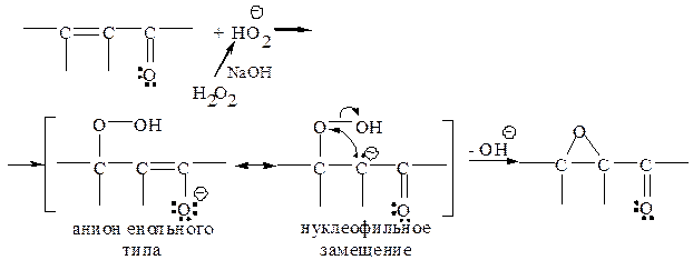 a,b-ненасыщенные кетоны перкислотами не эпоксидируются. Тем не менее их (включая хиноны), а также a,b-ненасыщенные альдегиды и сульфоны эпоксидируют действием щелочного раствора H2O2. Это нуклеофильное присоединение по механизму, аналогичному присоединению по Михаэлю, с первоначальной атакой иона HO2y и последующим внутримолекулярным нуклеофильным замещением: