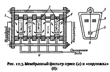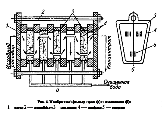 Основа этой конструкции (рис.6) — фильтрующий элемент, состоящий из двух мембран, уложенных по обе стороны листов «подложки», изготовленных из пористого материала, например полимерного. Листы «подложки» имеют отверстия для прохода жидкости и расположены на расстоянии 0,5...5 мм друг от друга, образуя межмембранное пространство для разделяемого раствора. Пакет фильтрующих элементов зажимается между двумя плитами и стягивается болтами. Фильтруемый раствор последовательно проходит через все фильтрующие элементы и концентрируется. Концентрат и фильтрат непрерывно удаляются из аппарата.