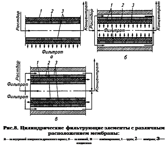 Цилиндрические фильтрующие элементы с комбинированным расположением мембран (см. рис.8, в) имеют примерно в 2 раза большую удельную рабочую площадь поверхности фильтрации, чем описанные. Однако такие конструкции обладают значительно большими гидравлическими сопротивлениями из-за значительной длины каналов для отвода фильтрата.