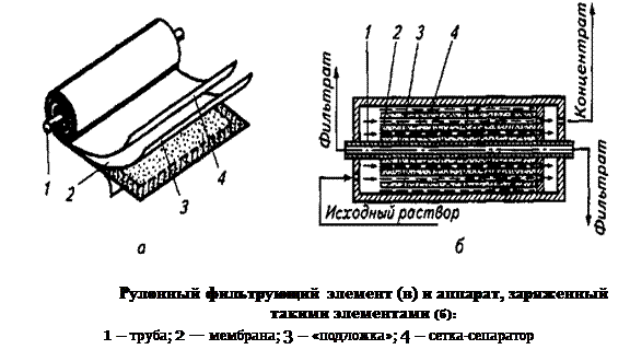 Аппараты с рулонными фильтрующими элементами выполняют в виде трубы, в которую последовательно вставлено несколько (плотность упаковки мембран 300...800 м2/м3) рулонных фильтрующих элементов (рис.9, а). Каждый элемент состоит из накрученного на отводящую трубу пакета из двух мембран и «подложки». Для создания межмембранного пространства между мембранами устанавливают сетку-сепаратор.