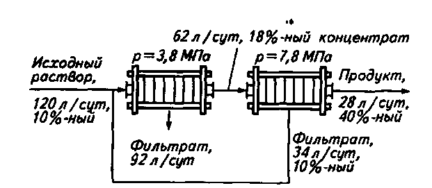 фильтрата со второй ступени. Основными аппаратами являются мембранные фильтр-прессы. Материальный баланс процесса представлен на схеме. В результате ультрафильтрации концентрация продукта повышается в 4 раза.