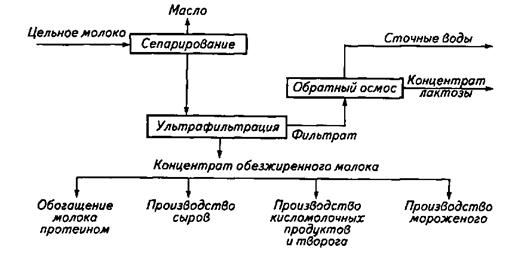 Схема переработки молока с получением основных молочных продуктов представлена на рис. 11. Основные технологические стадии — сепарирование молока с получением масла, ультрафильтрация обезжиренного молока и обратный осмос. Из концентрата обезжиренного молока получают ассортимент молочных продуктов. Использование мембранных аппаратов при переработке молока позволяет также решить проблему очистки сточных вод.