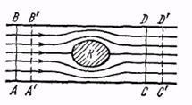 2. Рассмотрим, прежде всего, стационарное течение идеальной несжимаемой жидкости. Допустим, что в отсутствие внешних тел жидкость течет параллельным потоком. Поместим в него какое-либо тело К (рис. 1). Оно исказит поток. Но на достаточно больших расстояниях от тела К (в «бесконечности») поток останется параллельным. По истечении некоторого времени движение жидкости установится. К этому установившемуся течению и относятся последующие рассуждения. Для конкретности будем считать, что жидкость течет в прямолинейной трубе. Вдали от тела К линии тока параллельны стенкам трубы и вследствие несжимаемости жидкости скорость ее в этих участках трубы одна и та же. А в силу уравнения Бернулли будет одинаково и давление Р. Рассмотрим часть жидкости ABDC, внутри которой находится тело К. Предполагается, что сечения АВ и CD находятся далеко от тела К, так что через них жидкость течет параллельным потоком. Спустя короткое время выделенная часть жидкости перейдет в положение A'B'D'C'. При этом ее импульс останется без изменения. Следовательно, полная сила, действующая на рассматриваемый объем жидкости в направлении потока, равна нулю. Но эта сила слагается из сил давления на основаниях АВ и CD и из силы F'x, с которой действует на жидкость тело К. (Давление стенок не дает слагающей в направлении потока.) Силы давления на основаниях АВ и CD уравновешивают друг друга, а потому F'x = 0. Следовательно, обращается в нуль и лобовое сопротивление Fx. Допустим теперь, что труба берется все шире и шире. Наш вывод остается справедливым для сколь угодно широкой трубы. Он останется верным и в пределе, когда трубы совсем нет, а поток во всех поперечных направлениях простирается до бесконечности. Итак, при стационарном течении идеальной несжимаемой жидкости или при равномерном движении тела в ней лобовое сопротивление равно нулю. Этот вывод в свое время казался неожиданным. Он получил название парадокса Даламбера (1717—1783). Наличие этого парадокса указывает на то, что при определении лобового сопротивления, испытываемого телом при равномерном движении в жидкости, последнюю нельзя рассматривать как идеальную. Если тело движется неравномерно, то парадокс Даламбера не возникает. Дело в том, что с движущимся телом всегда связана какая-то масса жидкости, увлекаемая им. Она называется присоединенной массой. При ускорении тела ускоряется и присоединенная масса жидкости. Поэтому для сообщения ускорения телу в жидкости требуется большая сила, чем для сообщения такого же ускорения при отсутствии жидкости. Это и значит, что жидкость оказывает сопротивление телу, движущемуся в ней ускоренно.