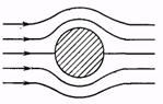 Парадокс Даламбера легко уяснить, если рассмотреть картину линий тока. На схематическом рис. 265 изображены линии тока при стационарном обтекании цилиндра или шара идеальной жидкостью. Линии тока совершенно симметричны по отношению к направлению вперед и назад (зеркальная симметрия). А скорости частиц жидкости в соответствующих точках перед и за телом равны по величине и отличаются только направлением. Но в уравнение Бернулли скорость входит в квадрате. Поэтому распределения давления в потоке перед и за телом совершенно одинаковы. Давление на переднюю поверхность тела уравновешивается давлением на заднюю поверхность, а следовательно, лобовое сопротивление равно нулю.