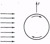 Ввиду того, что скорость воздуха убывает наружу, вращение в пограничном слое происходит против часовой стрелки, т. е. противоположно вращению самого цилиндра. При больших числах Рейнольдса ламинарное движение в пограничном слое неустойчиво и должно переходить в турбулентное. Но и в турбулентном пограничном слое вращение частиц воздуха в основном должно происходить противоположно направлению вращения цилиндра. Допустим теперь, что вращающийся цилиндр обдувается равномерным потоком воздуха слева направо. Сверху цилиндра направление потока совпадает с направлением вращения цилиндра, а снизу — противоположно ему. Частицы в пограничном слое сверху цилиндра ускоряются потоком, что препятствует отрыву пограничного слоя. Наоборот, снизу поток тормозит движение в пограничном слое и способствует его отрыву. Отрывающиеся части пограничного слоя уносятся потоком в виде вихрей, в которых направление вращения происходит против часовой стрелки. Вследствие этого вокруг цилиндра возникает циркуляция скорости в противоположном направлении, т. е. в том же направлении, в каком вращается цилиндр. Вместе с циркуляцией появляется и подъемная сила, направленная вверх. При изменении направления вращения цилиндра на противоположное подъемная сила также меняет направление на противоположное. Для бесконечно длинного цилиндра в обоих случаях величина подъемной силы определяется формулой Жуковского — Кутта.