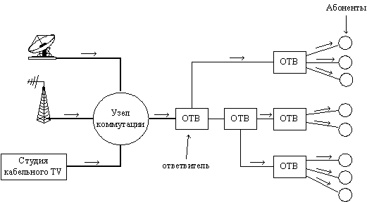 Распределительной сетью (Distribution Network) называют сегмент телекоммуникационной сети, посредством которого концентрированный поток, поступающий из транспортной сети, перераспределяется и доводится до потребителей. Классическим примером такой сети может служить сеть оператора кабельного телевидения (рис.3).
