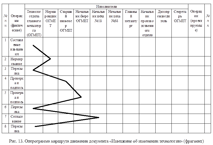 Позволяет увидеть последовательные этапы (операции) выполнения работы с указанием исполнителей. Может предусматривать дополнительную графу для определения более рациональной процедуры за счет исключения дублирующих операций, сокращения количества согласований и контроля (см. рис. 13).