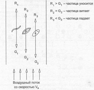 Если частица находится в вертикальном воздушном потоке (рис.2), то действующие на нее силы направлены в противоположные стороны и можно выделить три случая: